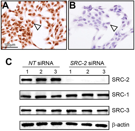 Expression of SRC-2 in HTR-8/SVneo cells: (A) Immunocytochemistry shows strong nuclear staining for SRC-2 expression in HTR-8/SVneo cells (white triangle). (B) Knockdown of SRC-2 results in negligible SRC-2 expression in HTR-8/SVneo cells (white triangle), demonstrating the specificity and efficacy of this siRNA-mediated gene knockdown approach. (C) Western immunoblot confirms both strong SRC-2 expression in HTR-8/SVneo cells (NT (control) siRNA group) and negligible SRC-2 expression (SRC-2 siRNA group); lanes 1–3 represent replicates for HTR-8/SVneo cells transfected with either NT siRNA or siRNA targeting SRC-2. The expression levels of SRC-1 and SRC-3 are not altered in HTR-8/SVneo cells following SRC-2 knockdown; β-actin is a loading control. Scale bar in panel (A) applies to panel (B).