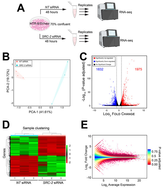 The HTR-8/SVneo cellular transcriptome is significantly changed following SRC-2 knockdown: (A) Schematic showing the key stages of the RNA-seq workflow; triplicate samples for the NT siRNA and SRC-2 siRNA treatment groups were used. (B) Principal component analysis (PCA) shows a clear separation between the triplicate NT siRNA and SRC-2 siRNA groups. (C) The volcano plot graphically displays the total number of genes differentially expressed between the NT siRNA and SRC-2 siRNA treatment groups; 1832 downregulated and 1975 upregulated genes are shown in blue and red, respectively. Significance (p-value) versus log2 fold change is plotted on the y- and x-axis, respectively. (D) The heatmap represents an unsupervised hierarchical clustergram of the total number of genes differentially expressed between the NT siRNA and SRC-2 siRNA groups that reached the FDR and IFCI thresholds of ≤0.05 and ≥1.3, respectively. Each row represents a gene, while each column denotes a sample replicate in each treatment group; the dendrogram on both axes shows the arrangement of the clusters following analysis. The intensity of the color indicates the level of expression for each gene in the sample replicate. The intensity in terms of the normalized expression values is indicated by the vertical color key on the right. (E) The MA plot shows the relationship between the log2 fold change and the mean normalized counts of DEGs in HTR-8/SVneo cells treated with NT siRNA or SRC-2 siRNA.