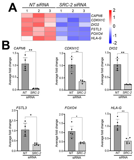 Knockdown of SRC-2 in the HTR-8/SVneo cell line attenuates the expression levels of genes previously reported to be expressed in extravillous trophoblast cells: (A) The heat map displays the alterations in gene expression between NT siRNA and SRC-2 siRNA replicates. The expression levels of calpain 6 (CAPN6); cyclin-dependent kinase inhibitor 1C (CDKN1C); iodothyronine deiodinase 2 (DIO2); follistatin-like 3 (FSTL3); forkhead box O4 (FOXO4); and human leukocyte antigen G (HLA-G) are significantly reduced in the SRC-2 siRNA-treated group compared with the NT siRNA group. (B) Quantitative real-time PCR confirms the above-predicted trophoblast cell marker gene expression changes between the NT siRNA and SRC-2 siRNA-treated groups. Results are indicated as the average fold change (±standard deviation) in expression of the gene of interest for each experimental condition (NT or SRC-2 siRNA knockdown). The average fold change (FC) calculation is detailed in the Section 2. All results presented are representative of three independent experiments; * p-value < 0.05; ** p-value < 0.01.