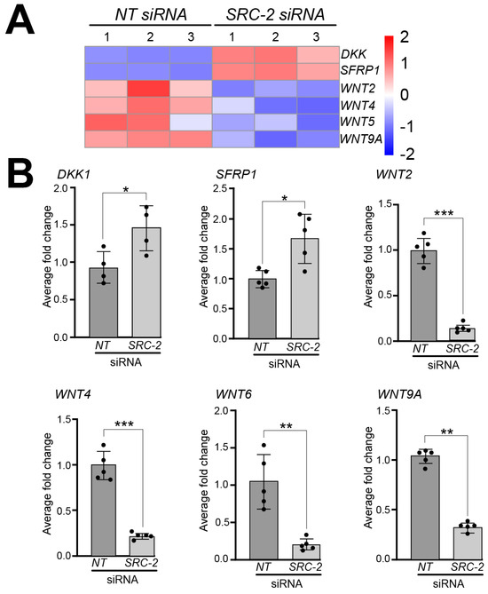 Dysregulated expression of WNT signaling factors in HTR-8/SVneo cells following SRC-2 knockdown: (A) Heat map displays marked changes in the expression of genes associated with WNT signaling between the NT siRNA and SRC-2 siRNA replicate groups. While WNT signaling inhibitors, Dickkopf WNT signaling pathway inhibitor 1 (DKK1) and secreted frizzled related protein 1 (SFRP1), are upregulated in the SRC-2 siRNA-treated group, the expression levels of Wnt family member 2 (WNT2), WNT4, WNT6, WNT8B, and WNT9A are significantly reduced. (B) Confirmation by qRT-PCR of the above-described gene expression changes between the NT siRNA and SRC-2 siRNA-treated groups is shown. An explanation of the average fold change (FC ± standard deviation) calculation is described in the Section 2. Results are representative of three independent experiments; * p-value < 0.05; ** p-value < 0.01, and *** p value < 0.001.