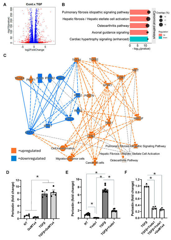 To more broadly investigate the molecular mechanisms underlying TGFβ-induced fibroblast activation, RNA sequencing was performed on NIH/3T3 fibroblasts treated with or without TGFβ. The analysis revealed that 856 genes were upregulated by more than two-fold (p ≤ 0.05), and 1254 genes were downregulated by more than two-fold (p ≤ 0.05) in the TGFβ-treated samples compared to controls (Figure 2A). As anticipated, pathway analysis of the differentially expressed genes (DEGs) using Ingenuity Pathway Analysis (IPA, Qiagen) identified fibrosis-related pathways as the most significantly affected. The top pathways predicted to be positively affected by TGFβ treatment included idiopathic pulmonary fibrosis signaling and hepatic fibrosis/stellate cell activation, as well as the osteoarthritis pathway and axonal guidance signaling. In contrast, cardiac hypertrophy signaling was predicted to be downregulated in the TGFβ-treated group (Figure 2B). To link specific DEGs to potentially affected pathways following TGFβ treatment, we performed a correlation analysis using IPA. Our findings revealed significant upregulation of pathways involved in cell transformation, pulmonary and hepatic fibrosis, and tumor cell migration (Figure 2C). The prediction that TGFβ induces fibrotic signaling pathways such as those involved in idiopathic pulmonary fibrosis and hepatic fibrosis is based on upregulation of genes such as connective tissue growth factor (CCN2), a known regulator of fibrosis [34,35]; endothelin 1 (EDN1), a potent vasoconstrictor with pro-fibrotic effects [36,37]; and MET protooncogene, which is involved in cell proliferation, migration, and tissue repair [38]. A focused analysis of ion channel expression identified Piezo1 as the most highly expressed ion channel in NIH/3T3 fibroblasts (Table 3), leading us to investigate the role of Piezo1 in TGFβ-induced fibroblast activation using Piezo1-specific agonists and antagonists (Figure 2D–F). As mentioned earlier, fibroblast activation was assessed by analyzing the expression of the fibroblast activation marker, Periostin. Surprisingly, we did not observe any effect on TGFβ-induced fibroblast activation in the presence of the Piezo1-specific inhibitor, GsMTx4 (Figure 2D). Interestingly, in contrast to previous reports, treatment with the Piezo1 agonist, Yoda1, inhibited both basal and TGFβ-induced Periostin (Figure 2E). Moreover, the addition of the Piezo1 antagonist, GsMTx4, did not reverse the inhibitory effect of Yoda1 (Figure 2F).