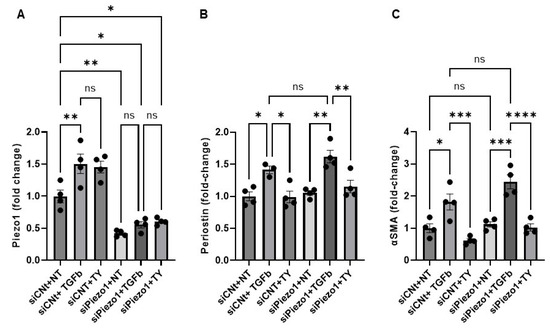 Furthermore, to evaluate the direct role of Piezo1 in Yoda1-mediated inhibition of TGFβ-induced fibroblast activation, we employed a specific siRNA targeting Piezo1 (siPiezo1) to achieve gene knockdown in cardiac fibroblasts. Scrambled siRNA-transfected groups were considered as transfection control. TGFβ and Yoda1 treatments were carried out as described previously to induce fibroblast activation and probe the potential modulatory effects of Piezo1. Our results show that siPiezo1 treatment led to a significant reduction in Piezo1 expression compared to cells treated with scrambled siRNA (siControl) (Figure 3A). To assess the functional impact of Piezo1 knockdown, cells were divided into three treatment groups, untreated, TGFβ alone, or TGFβ combined with Yoda1, under both siPiezo1 and siControl conditions. Despite a greater than 50% knockdown of Piezo1, no significant differences were observed in the expression levels of Periostin (Figure 3B) or α-SMA (Figure 3C) in the treatment groups, no treatment, TGFβ, or TGFβ + Yoda1, when compared to their respective siControl counterparts. These findings suggest that although Piezo1 may contribute to stress-induced activation of fibroblasts, it is unlikely to be a major mediator of TGFβ-induced fibroblast activation or Yoda1-mediated suppression of TGFβ-driven activation.