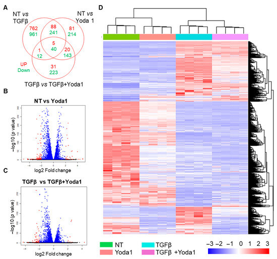 Gene expression profiling in NIH/3T3 fibroblasts: Effects of TGFβ and Yoda1. (A) The Venn diagram illustrates the overlap of upregulated and downregulated genes across the different study groups. Volcano plots comparing genes upregulated or downregulated in response to (B) Yoda1 versus control and (C) TGFβ versus TGFβ + Yoda1 in NIH/3T3 fibroblasts. The orange dots represent significantly upregulated or downregulated genes, whereas blue dots represent the genes with no significant difference in expression. (D) The heatmap displays the gene expression profiles of NIH/3T3 fibroblasts across the study groups: control, Yoda1, TGFβ, and TGFβ + Yoda1. NT = no treatment.
