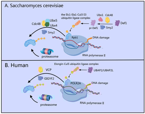 In human cells, GIGYF1/2 proteins serve as key regulatory factors that interact with VCP (the mammalian homolog of yeast Cdc48), specifically facilitating the extraction and proteasomal degradation of ubiquitylated POLR2A (the human homolog of yeast Rpb1) [47,52] from stalled transcription complexes [49] (Figure 2B). Sophisticated biochemical fractionation experiments have demonstrated that GIGYF2 maintains substantial chromatin association, which becomes markedly enhanced following UV-induced DNA damage, highlighting its direct involvement in the transcription stress response [49]. Recent research has identified UBAP2/UBAP2L as the human orthologs of yeast Def1, establishing their critical role in recruiting the Elongin-Cul5 ubiquitin ligase complex to sites of DNA damage [47]. This recruitment follows a highly coordinated two-step ubiquitylation mechanism: NEDD4 (the human ortholog of yeast Rsp5) acts as the initial E3 ubiquitin ligase [53], adding a single ubiquitin moiety to POLR2A, after which the Elongin-Cul5 ubiquitin ligase complex builds K48-linked polyubiquitin chains on this mono-ubiquitinated substrate [52,54,55,56]. These K48-linked chains effectively mark POLR2A for proteasomal degradation, representing a critical “last resort” pathway in the cellular response to transcription-blocking DNA damage [56].