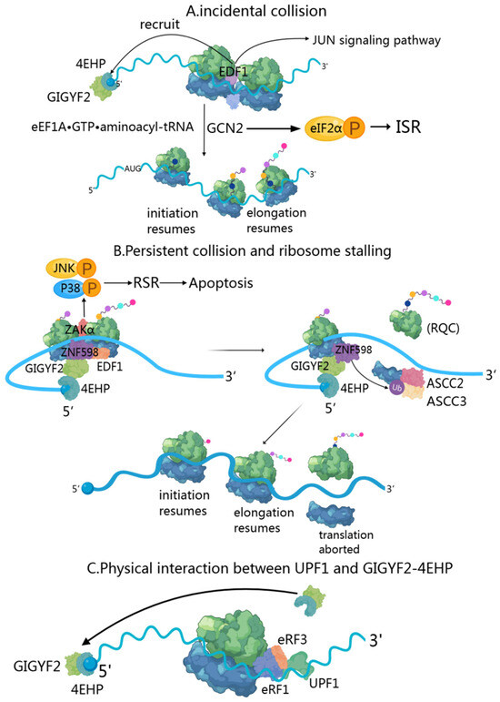 When two ribosomes collide, EDF1 (endothelial differentiation-related factor 1) is the first responder due to its high cellular abundance [40,69,70]. During transient collisions, EDF1’s engagement triggers a series of coordinated responses. Initially, EDF1 utilizes its conserved KKW motif and alpha-helical segment to clamp the mRNA in a headlock-like arrangement [71], stabilizing collided ribosomes and preventing frameshifting. Through RACK1-dependent and ZNF598-independent mechanisms, EDF1 recruits and stabilizes the GIGYF2-4EHP complex to collision sites [40] (Figure 3A). The GIGYF2-4EHP complex implements translational inhibition via 4EHP-mediated sequestration of the 5’ cap structure, effectively reducing ribosome density along the mRNA [20,71]. Notably, this regulatory mechanism requires both ribosome stalling and intact cap-binding functionality [15].