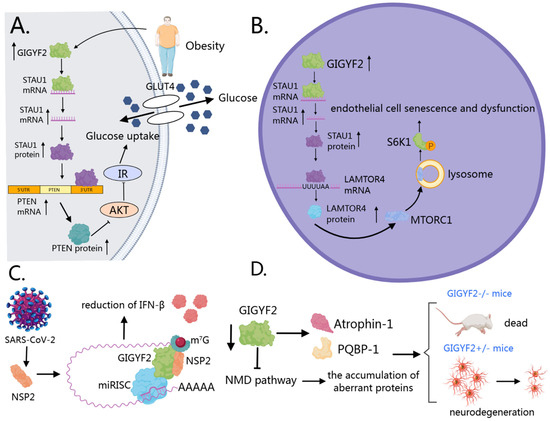 The extensive involvement of GIGYF2 in multiple regulatory mechanisms spanning transcriptional control, translational repression, and mRNA degradation positions this protein as a significant coordinator of cellular homeostasis. The functional consequences of GIGYF2 activity extend beyond normal physiological processes to pathological states. The alterations in GIGYF2 expression, regulation, or protein–protein interactions have been documented across several disease contexts. The subsequent section examines the evidence linking GIGYF2 to specific pathological conditions, including metabolic diseases, vascular aging, viral infections, and neurodegenerative disorders, thereby elucidating the clinical implications of this molecular regulator.