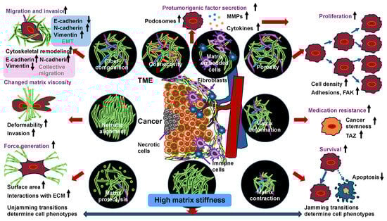 So far, the emphasis has been on the impact of cell–cell interactions on the jamming transition occurring in the invasion of cancer cells. Once cancer cells escape the primary tumor, however, their encounters with the surrounding environment, which is characterized by different biochemical and physical features, can drive metastatic progression. The TME has a complex structure. It consists of various cellular and extracellular constituents, like cancer cells, stromal cells, immune cells, cancer-associated fibroblasts (CAFs), and noncellular elements inside the ECM (Figure 2). All these elements can alter the mechanical signature of the entire tissue in the environment of solid cancers [2,5,152,153,154,155]. Besides biochemical cues, physical signals from the microenvironment can strongly influence cell proliferation, migration, and the potential for metastasis [153,156,157]. The capacity of cells to collectively undergo migration is impacted through microenvironmental factors like cell density and ECM characteristics. Due to elevated levels of ECM compounds like collagen and fibronectin, solid cancer tissues are frequently stiffer compared to normal healthy tissue [158]. Mechanical effects like ECM stiffness or interstitial pressure and mechanical forces such as tension and compression have been proven to modulate the metabolic activity, proliferative capacity, migratory behavior, and stemness of cancer cells [32,159,160] (Figure 2).