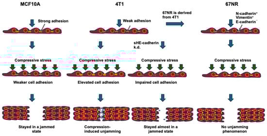 During this process, the 4T1 cells lengthen and form strong cell–cell adhesions, while E-cadherin is destroyed at the cell–cell contact between MCF10A cells [32]. As mesenchymal hallmarks are not elevated in compressed 4T1 cells, this compression-based transition differs from EMT. Compression decreases tensile stresses in microstructured cell clusters and inside the monolayer for MCF10A and 4T1 cells. Consequently, Cai and coworkers have revealed that increased intercellular adhesion and decreased traction inside the cell layer control the different cellular responds to mechanical compression and promote jamming–unjamming transitions (Figure 3) [32].