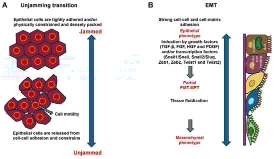 | Enhanced migration and invasion | Elevated migration as individual cells or as a collection of cells [289]. | During the transition from jamming to unjamming, the cell layer migrates but keeps its complete epithelial nature [13,62]. |