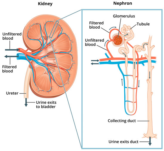 Kidney and nephron. “Image of a close up nephron and its place in the kidney. Labels on the kidney cross section show where unfiltered blood enters, filtered blood leaves, and urine exits”. National Institute of Diabetes and Digestive and Kidney Diseases, National Institutes of Health. Available online: https://www.niddk.nih.gov/news/media-library/11236 (accessed on 1 February 2025).