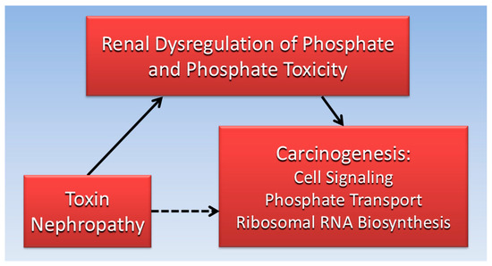 One dietary factor that is a potential etiological determinant in both CKD and cancer is the previously mentioned essential mineral phosphorus [37]. Absorbed from the diet in the form of inorganic phosphate (Pi), this mineral is regulated in the serum by an endocrine network consisting of the kidneys, intestines, parathyroid glands, and bones. Furthermore, dysregulated Pi can accumulate in tissue, causing a harmful condition known as phosphate toxicity [37]. The present paper uses a pathophysiological perspective to review cellular mechanisms and other evidence linking impaired kidney function with carcinogenesis, potentially mediated by dysregulated phosphate metabolism and phosphate toxicity. The paper specifically focuses on toxin nephropathy that reduces renal function, leading directly to harmful effects of hyperphosphatemia and phosphate toxicity, and indirectly to carcinogenic effects within the tumor microenvironment.