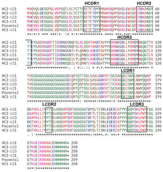 Amino acid sequences of humanized hscFvs. Amino acid sequences of five humanized hscFv candidates (HC1-LC1, HC2-LC1, HC2-LC3, HC3-LC3, and HC3-LC1) and their FRs and CDRs were determined (Clustal Omega, IMGT information system, respectively). A normal 15-amino-acid linker [(G4S)3] joins the HC and LC chains. Alignments were color-coded according to residue property groups. AVFPMILW—red, DE—blue, RK—magenta, STYHCNGQ—green, others—grey.