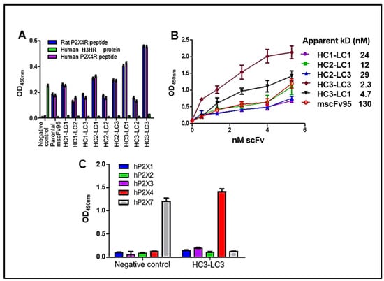 (A) Binding of scFvs to rat and human P2X4 peptides. The binding of the purified P2X4-humanized hscFvs in comparison to the parent murine scFv was tested by ELISA. The negative control was an scFv raised against histamine H3HR. (B) Binding of several of the purified humanized P2X4 hscFvs (HC1-LC1, HC2-LC1, HC2-LC3, HC3-LC3, and HC3-LC1) were compared and found to have better binding than the murine parent mscFv95. Each point represents the mean ± s.d. values of triplicate wells. (C) The hscFv with the best binding affinity, HC3-LC3, was selected as the lead. HC3-LC3 specifically bound to soluble human P2X4R but not to human P2X purinergic family receptors P2X1, P2X2, P2X3, P2X7. Anti-P2x7 bound only hP2x7peptide as a control.