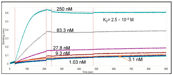The HC3-LC3 exhibited a single band with an apparent molecular mass 28 kDa, which is within the expected size for the monomeric form of this protein. This was determined in gel electrophoresis and Western blot (Figure 4). Octet measurements further revealed that the HC3-LC3 had binding kinetics of KD = 2.5 × 10–9 M (Figure 5). This hscFv molecule also maintained the required monomer resolution on size exclusion chromatography (SEC-UPLC) and capillary electrophoresis (CE-SDS) under denaturing and reducing conditions (Figure 6A,B). The lead HC3-LC3 clone was selected for further testing in in vivo chronic pain models.