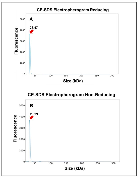 A high-throughput microchip capillary electrophoresis-based separation method was applied to analyze scFv purity (HT Protein Express assay, Microchip CE-SDS, PerkinElmer LabChip GXII Touch HT Protein Characterization System) [7]. Advantages of this advanced technology include accurate and quantifiable results, time efficiency, and minimal sample preparation artifacts. Samples (1 mg/mL) were run using default injection for both reduced and non-reduced separation conditions according to the manufacturer’s instructions. The CE-SDS data generated by LabChip were exported from each platform and imported into EmpowerTM 3.8.1 Software (Waters Corporation, Milford, MA, USA) for analysis.