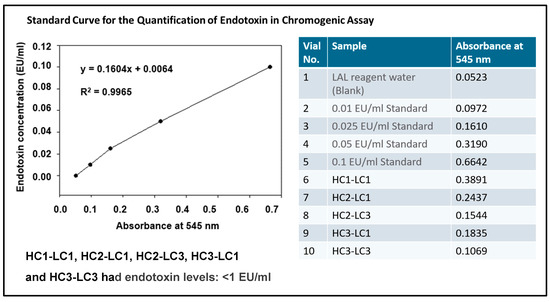 Endotoxin concentrations were assessed under standard conditions. Absorbance at 545 nm was determined against the blank and four standards plotted in a best-fit linear relationship in the concentration range of 0.01–0.1 EU/mL. The table provides the absorbances for the standards and five hscFvs.