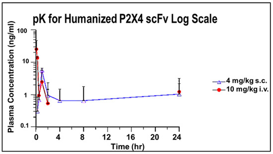 P2X4 hscFv is measurable in the plasma for over 24 h. Plasma concentration was measureable for over 24 h and was determined for both the 4 and 10 mg/kg doses.