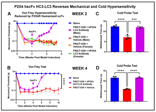 Single-dose humanized hP2X4R HC3-LC3 hscFv effectively reverses mechanical and cold hypersensitivity in male but not female mice (A). (A) Single 4 mg/kg dose of the P2X4 hscFv was given in week 2, reversing the von Frey threshold to naïve baseline in male mice but not female mice (n = 6). (B) Treatment in week 4 after induction of the FRICT-ION trigeminal chronic neuropathic pain model was also effective in reversing the mechanical threshold to naïve baseline with the single dose. The von Frey testing was continued once each week demonstrating the durability of single dose of P2X4R hscFv HC3-LC3 (4 mg/kg) through >10 weeks (n = 4). Two-way ANOVA (Dunnett’s multiple comparison’s test), **** p < 0.0001) (C). Cold hypersensitivity tested in week 1 was reversed in the mice with FRICT-ION when P2X4 hscFv was given in week 2 (n = 4). (D) Cold hypersensitivity is also reversed in the mice with FRICT-ION when P2X4 hscFv was given in week 4 (n = 4). *** p < 0.001 vs. FRICT-ION, 2-way ANOVA; **** p < 0.0001 vs. naïve or FRICT-ION.