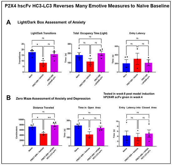 (A) Anxiety-like measures with the light/dark place preference test indicated are altered in mice with FRICT-ION chronic neuropathic pain. P2X4R hscFv prevented development of the anxiety-like behaviors observed, including number of transitions between the boxes, time spent in the light, and decreased latency for lighted box entry which are similar to naïve controls. Data is shown for the mice treated in week 4. n = 4, one-way ANOVA (Dunnett’s multiple comparisons test); * p < 0.05, (B). FRICT-ION model alters most measures observed with the zero maze test, including distance traveled, time in the open areas, and latency to first entry into the closed area. Anxiety/depression behaviors with P2X4R hscFv-treated mice are similar to naïve control. Data is shown for the mice treated in week 4. n = 4, ns = not significant, one-way ANOVA (Dunnett’s multiple comparisons test); * p < 0.05, ** p < 0.01.