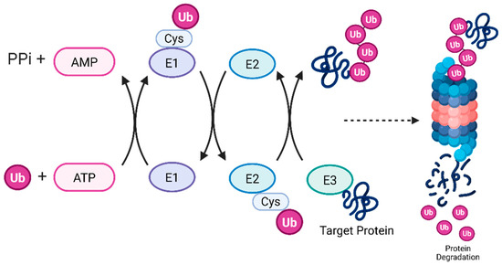 A schematic depicting the enzymatic cascade involved in the ubiquitin–proteasome system. The first step involves E1 utilizing ATP to activate ubiquitin. Next, ubiquitin is shuffled from E1 to E2. Finally, E3 marks the target protein with ubiquitin, marking it for degradation via the proteasome. This figure was crafted with the help of BioRender (https://app.biorender.com/, accessed on 3 February 2025).