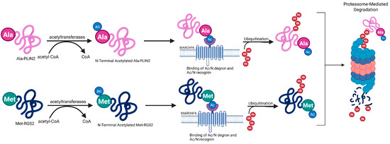 A schematic depicting N-terminal acetylation of Ala-PLIN2 and Met-RGS2. This N-terminal acetylation generates an Ac/N-degron, and these proteins are recognized by MARCHF6, which mediates their ubiquitination and their subsequent proteasomal degradation. This figure was crafted with the help of BioRender.