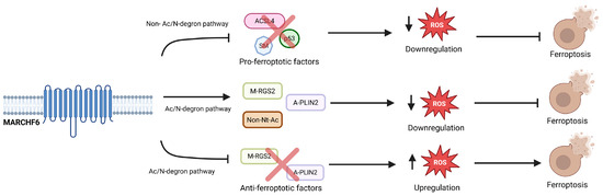 MARCHF6 has been shown to suppress ferroptosis by facilitating the degradation of specific substrates. Understanding the mechanism of degradation and recognition is integral to understanding ferroptosis. The C5 region of MARCHF6 has been identified as the site of the Ac/N domain, the specific binding site lying between the C5 552 and 579 region. This region identifies Nt-acetylatable substrates like RGS2 and PLIN2 and marks the proteins for ub-mediated degradation. This system has now been demonstrated to regulate ferroptosis as well. MARCHF6 can regulate ferroptosis through the inhibition of pro-ferroptotic effectors causing the upregulation of anti-ferroptotic factors that were experimentally discovered through a mutant MARCHF6. However, MARCHF6 can also assist ferroptosis by degrading the substrates of the Ac/N degron pathway like N-terminal acetylated M-RGS2 and A-PLIN2 that inhibit ferroptosis. The dual function of MARCHF6 confers the rheostatic role of the MARCHF6 E3 ub-ligase in ferroptosis as it can affect pro-ferroptotic substrates and anti-ferroptotic substrates (Figure 3). However, these functions must exist in a delicate balance as cellular stress can alter the functions of MARCHF6.