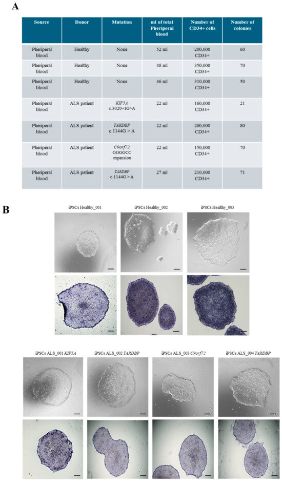CD34+ cells reprogramming into iPSCs. (A) List of ALS and healthy donors from whom iPSCs were generated. (B) Upper panel: Representative phase-contrast microscopy showing ESC-like morphology of both healthy and ALS CD34+ cell-derived iPSCs. Lower panel: Positivity for alkaline phosphatase staining of healthy and ALS iPSCs. Scale bars, 100 μm.