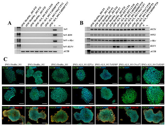 All iPSC clones were characterized by the expression of exogenous and endogenous pluripotency markers. Considering the nature of the Sendai Virus, the residual amount of virus in obtained healthy and ALS iPSCs were evaluated. Specifically, we selected iPSCs that had reached the 10th passage, and by RT-PCR we demonstrated that there was no residual of the Sendai virus in transduced cells, confirming the silencing of exogenous markers compared to positive controls represented by iPSCs 15 days post-reprogramming (Figure 2A). On the contrary, endogenous markers were highly expressed at the RNA level by iPSCs at the same passages (Figure 2B), demonstrating the stable reprogramming of iPSCs and their sustained staminality. These data were also demonstrated at the protein level, showing a high expression of Oct4, Sox2, Ssea3, and Tra1-60 both in healthy and ALS iPSCs (Figure 2C). To further confirm the expression of ALS-associated mutated genes in the iPSC lines, we assessed protein levels for TARDBP, KIF5A, and C9orf72. As shown in Figure 2D, C9orf72, KIF5A, and TDP-43, were detected at protein levels in iPSCs. These results demonstrate that the ALS-related genes are expressed at both transcriptional and protein levels in healthy and ALS iPSC lines. Finally, we exploited the ability of iPSCs to mimic embryogenesis at the level of the gastrula by generating embryoid bodies (EBs) from both healthy and ALS iPSCs (Figure 2E). We investigated the expression of key markers for the three germ layers by RT-PCR: NES, NCAM, and OTX2 for the ectoderm; ACTA2, TBXT, and TBX6 for the mesoderm; and FOXA2, SOX17, and AFP for the endoderm (Figure 2F). Our results demonstrated that all iPSC lines successfully generated EBs that expressed high levels of the typical markers of ectoderm, mesoderm, and endoderm, confirming the differentiation potential of the obtained iPSCs.