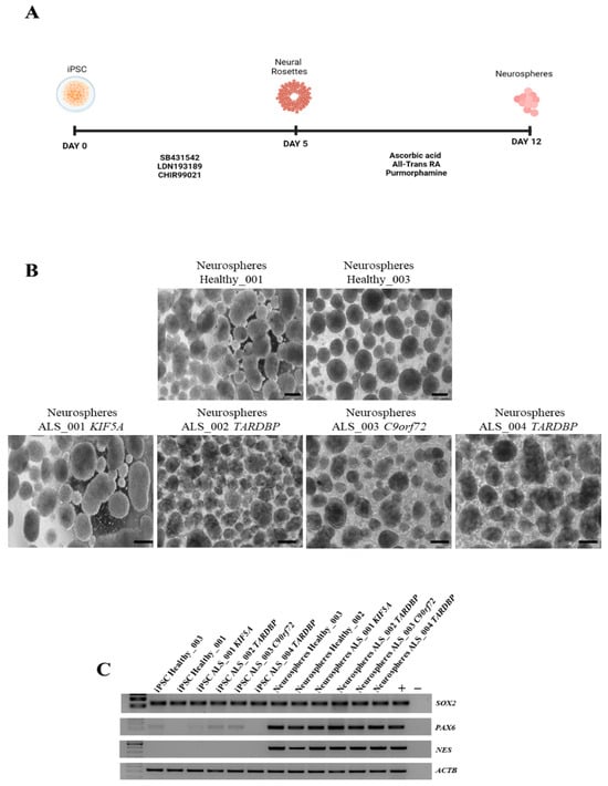 Healthy and ALS iPSCs were detached when they reached 80% of confluence and dissociated, and 15 × 104 cells were plated with Essential 8 and 10 µM of Rock Inhibitor (Y-27632) (Sigma-Aldrich, Burlington, MA, USA). The induction of neurosphere differentiation was achieved using medium composed of DMEM/F12 (Gibco), neurobasal medium (Gibco) 0.5× N2 (Gibco), 0.5× B27 (Gibco), Glutamax (Gibco), and non-essential amino acids (Gibco) supplemented by small molecules such as SB431542 (Stem Cell Technologies, Vancouver, BC, Canada), LDN193189 (Stem Cell Technologies), CHIR99021 (Stem Cell Technologies), ascorbic acid (Sigma), all-trans RA (Stem Cell Technologies), and purmorphamine (Stem Cell Technologies). For neurosphere generation we followed the main steps described in the literature [15,16].