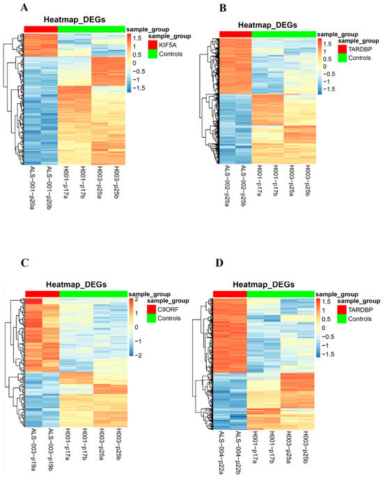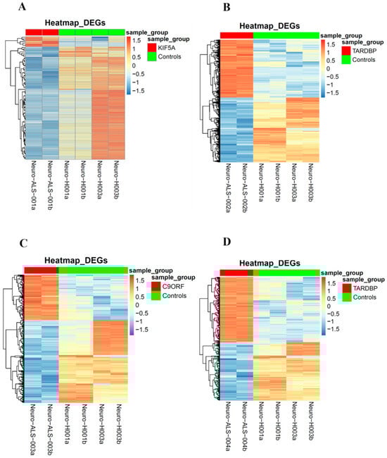 Heatmaps of the differentially expressed genes in iPSCs: Heatmaps of the differentially expressed genes of each of the four ALS patients in comparison to the matched healthy controls. Patients’ differentially expressed genes are represented on the left (top red bar); healthy controls’ differentially expressed genes are represented on the right (top green bar). (A): ALS001_KIF5A vs. HC; (B): ALS002_TARDBP vs. HC; (C): ALS003_c9orf72 vs. HC; (D): ALS004_TARDBP vs. HC.