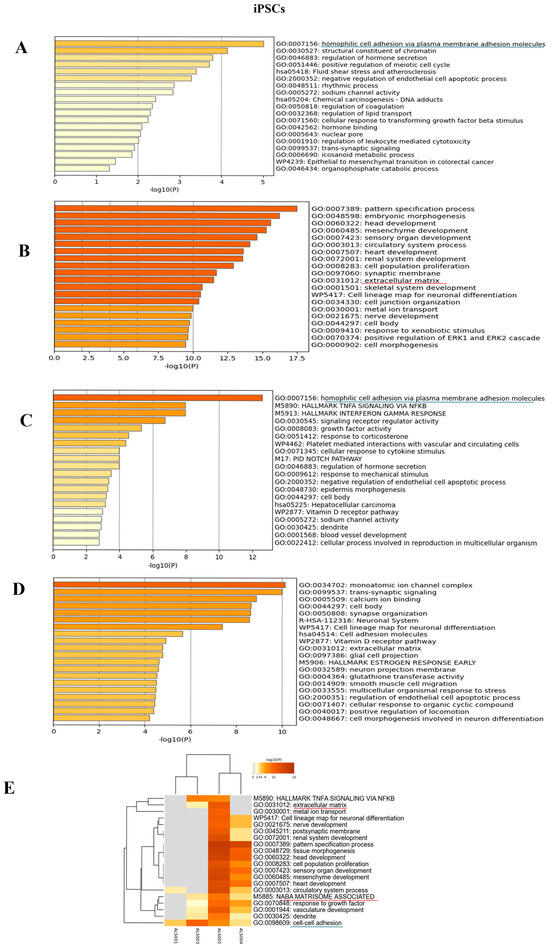 Enrichment analysis: Enrichment analysis results of the comparison between each of the four ALS patients and the matched healthy controls, at iPSC level. (A): Enrichment analysis for ALS001_KIF5A vs. HC; (B): enrichment analysis for ALS002_TARDBP vs. HC; (C): enrichment analysis for ALS003_c9orf72 vs. HC; (D): enrichment analysis results for ALS004_TARDBP vs. HC; (E): integrative and comparative enrichment analysis among the four subjects. The DEGs for all comparisons include either upregulated or downregulated genes. At iPSC level, we underlined in different colors the shared pathways (blue for cell-adhesion pathways and red for matrisome, extracellular-matrix pathways).