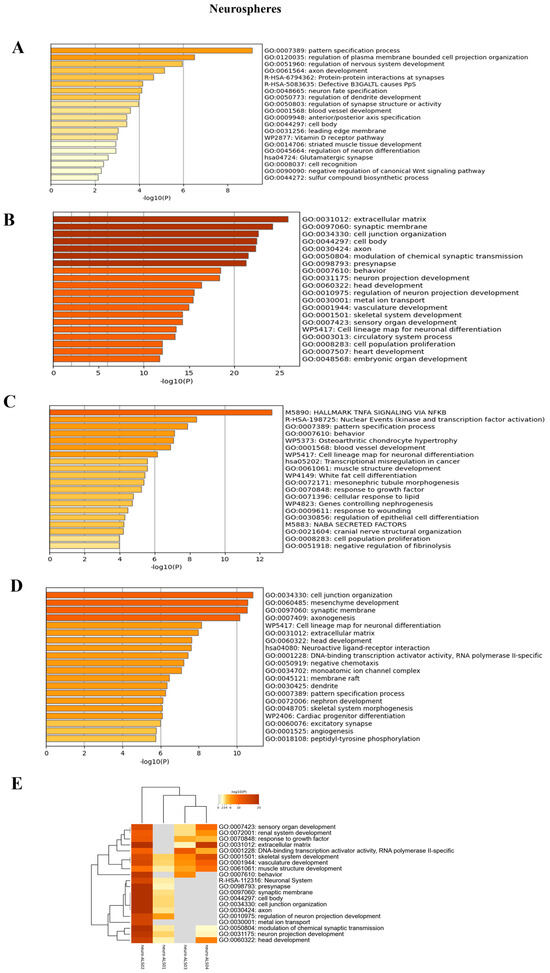 Enrichment analysis: Enrichment analysis results of the comparison between each of the four ALS patients and the matched healthy controls, at neurosphere level. (A): Enrichment analysis for ALS001_KIF5A vs. HC; (B): enrichment analysis for ALS002_TARDBP vs. HC; (C): enrichment analysis for ALS003_c9orf72 vs. HC; (D): enrichment analysis results for ALS004_TARDBP vs. HC; (E): integrative and comparative enrichment analysis among the four subjects. The DEGs for all comparisons include either upregulated or downregulated genes.