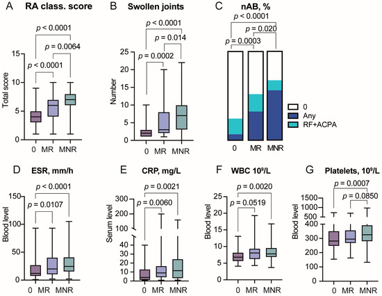 Association between the RA classification score and methotrexate response. (A) Box plot of RA classification score in methotrexate-responders (MR, n = 92), methotrexate non-responders (MNR, n = 80) and patients not treated with methotrexate (0, n = 85). (B) Box plot of swollen joint counts at the 1st visit. (C) Stacked bar plot of frequency of RA-specific antibodies RF and ACPA. AB negative, 0 points; RF or ACPA, 1 point; RF and ACPA, 2 points. (D) Erythrocyte sedimentation rate (ESR). (E) C-reactive protein (CRP). (F) White blood cell (WBC) count. (G) Platelet count.