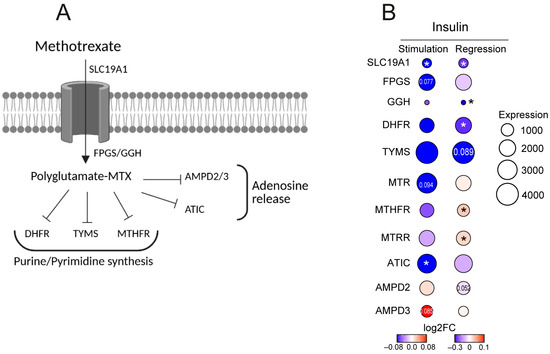 MTX is absorbed into the cells through the folate transporter transmembrane solute carrier SLC19A1. Intracellular MTX is polyglutamated to its active form by the enzymes FPGS and GGH. The modified MTX inhibits several enzymes of the folate metabolism, including MTHFR, MTR, MTRR, and thymidylate synthetase TYMS and ATIC that together, regulate the production of purines and pyrimidines required for DNA and protein synthesis, AMPD2/3 that control adenosine release, and dihydrofolate reductase DHFR catalyzing nitric oxide synthase uncoupling (Figure 3A). Genetic variants in the MTX targeting enzymes have been repeatedly associated with poor response to MTX treatment [8,10,26]. In CD4+ cells, the enzymes affected by MTX are highly expressed (Figure 3B). To investigate the effect of insulin on these enzymes, we profiled the transcriptome through RNA-seq after stimulating CD4+ cells with insulin (six healthy controls, 10 nM, 48 h). In parallel, we performed linear regression of gene expression in CD4+ cells to increasing levels of insulin using 80 RNA-seq datasets of MTX treatment-naïve patients.