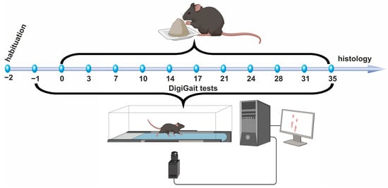Gait parameters were assessed using the DigiGait™ imaging system along with the DigiGait™ 15.0 analysis software (Mouse Specifics, Inc.; Quincy, MA, MA) as previously published by our group [33,34]. The DigiGait™ apparatus consists of a clear plastic treadmill with a high-speed under-mounted digital camera (frames/s, Basler Technologies Inc., Ahrensburg, Germany) used for imaging paw prints during running. Animals were habituated to the machine 1 day prior to testing (compare Figure 1). The minimal duration of each video sequence required for subsequent footprint analyses was 5 s, which has been shown to be sufficient for reliable gait analyses in mice [37]. The velocity of the treadmill belt was 15 cm/s. Images were collected at a rate of 181 frames/s and stored as audio–video interleaved (AVI) files for later blinded analyses. To improve the contrast for automated footprint analysis, the tails of the mice were colored with black dye. The treadmill belt was cleaned with 70% (v/v) ethanol between each animal testing. The image analysis software digitally encoded the individual paw area and position relative to the tread-belt. Each paw of the animal was treated as a unique signature so that later analyses of foot movements could be performed on separate limbs. The DigiGait™ analysis software subsequently computed a variety of gait parameters for the fore limbs and for the hind limbs of each animal [33,34,37].