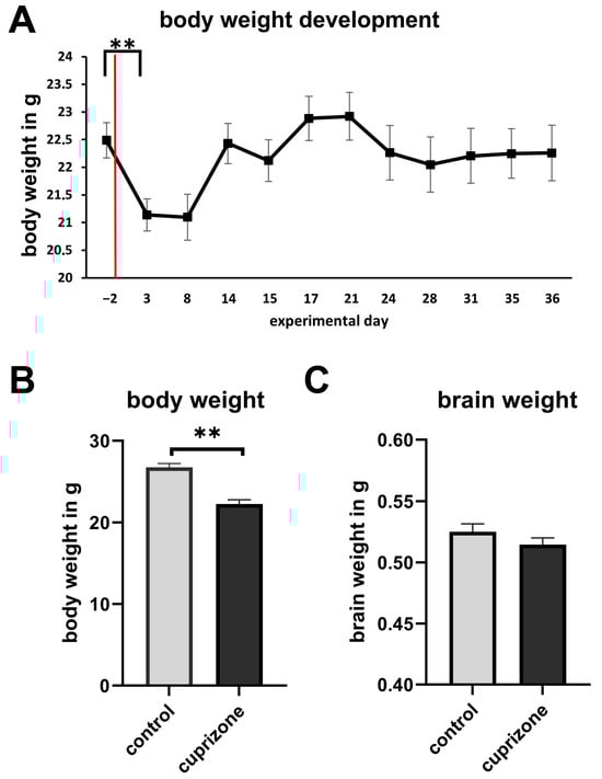 (A) Average body weight of mice throughout the study. The red line marks the initiation of cuprizone intoxication. Error bars represent the standard error of the mean (SEM). Statistical analysis was performed using one-way ANOVA followed by Tukey’s post hoc test, comparing pre-intoxication body weights to each subsequent time point. A significant reduction in body weight was observed shortly after the onset of cuprizone treatment. (B) Cuprizone-intoxicated mice (n = 9) exhibited significantly lower body weights compared to control mice (n = 4). Statistical significance was determined using the Mann–Whitney U test. (C) Mean brain weights on the day of perfusion. Data are presented as mean ± SEM. ** p < 0.01.