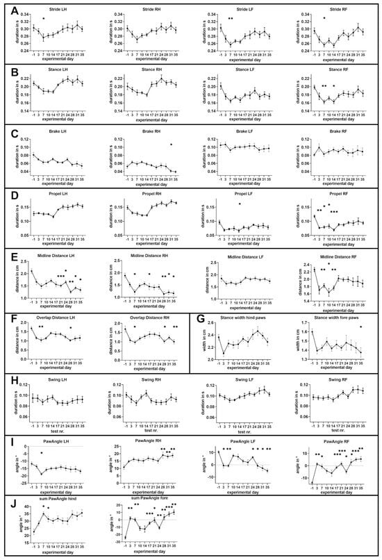 Overlap distance refers to the horizontal distance between the placement of the fore paw and the hind paw on the same side during a step cycle. As shown in Figure 3F, both hind paws exhibited an initial significant decline in overlap distance, followed by a modest recovery, and subsequently a further decline. The most pronounced decline of the overlap distance for the left hind limb was measured at day 28 from 1.684 ± 0.103 cm to 1.029 ± 0.061 cm with p = 0.022; Friedman test with Dunn’s multiple comparison) and for the right hind limb the maximum decline was measured at day 7 (from 1.689 ± 0.168 cm (day −1) to 0.974 ± 0.1 cm with p = 0.011; Friedman test with Dunn’s multiple comparison).