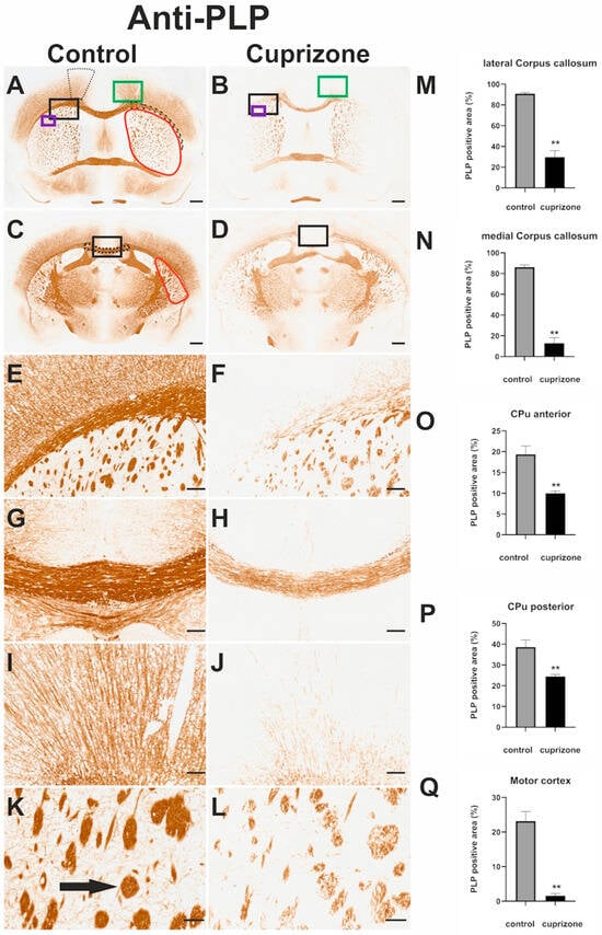 In the CC, the relative staining intensity of PLP-positive areas in the lateral CC decreased from 90.9 ± 1.13% in controls to 29.73 ± 6.22% in cuprizone-treated mice (p = 0.002; d = −4.144; Mann–Whitney test), and in the medial CC from 86.11 ± 2.23% to 12.78 ± 5.45% (p = 0.002; d = −5.589; Mann–Whitney test), (Figure 4M,N).