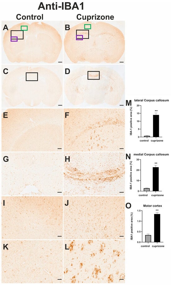 A significant increase in immunoreactivity for IBA1 was observed in cuprizone-intoxicated mice compared to control mice in the CC, MC, and fiber tracts of the CPu (Figure 5A–L). In contrast to control mice, the microglial cells of cuprizone-intoxicated mice showed shorter processes and a more amoeboid morphology (see Supplementary Figure S1). In cuprizone-intoxicated mice, clear signs of inflammatory processes were detected in various areas of the brain. The proportion of IBA1-positive areas in the medial CC, lateral CC, and MC was significantly higher than in control animals (Figure 5M–O).