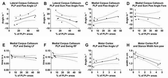 To compare the data of brain weights, body weights, and staining intensities, non-parametric data were assumed due to the low number of control animals (n = 4) included in these analyses. These groups were compared by Mann–Whitney tests. To assess correlations between gait parameters and the results of planimetric histological analyses, Pearson’s correlation was applied to normally distributed data, while Spearman’s rank correlation was used for non-normally distributed data. Confidence intervals were not calculated for the Spearman correlations due to the limited sample size.