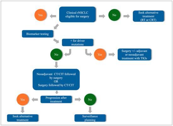 Workflow for rNSCLC. rNSCLC: resectable non-small cell lung cancer; RT: radiotherapy; CRT: chemoradiotherapy; TKI: tyrosine kinase inhibitor; CIT: chemoimmunotherapy.