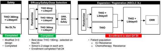 THIO-101 is a Phase 2, randomized, dose-optimization clinical study in adults with advanced NSCLC without genetic mutations who either progressed or relapsed after one to four prior treatment lines including ICI alone or in combination with platinum chemotherapy (NCT05208944). Using a modified 3 + 3 design, the safety lead-in (Part A) enrolled 10 patients who received ateganosine (THIO) 360 mg IV (120 mg daily on days 1, 2 and 3), followed by 350 mg cemiplimab on day 5, administered every three weeks. Following completion of Part A, enrollment was opened in the dose-finding portion of the study (Part B). Using a Simon 2-stage design, 79 patients were assigned to 360, 180, or 60 mg of THIO followed by cemiplimab every three weeks for up to 1 year in Part B. Patient disease status was assessed at cycle 3 day 1, cycle 5 day 1 and subsequently every 9–12 weeks. The trial completed enrollment in Parts A and B in February 2024, and the ateganosine dose of 180 mg/cycle was proven to be the most efficacious and selected as the optimal dose for further clinical development. The trial expansion is scheduled to begin in 2025 for third-line patients, comprising two arms: ateganosine as a single agent and ateganosine sequenced with libtayo (Figure 2).