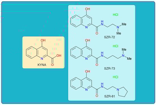 The chemical structures of kynurenic acid and its analogs. KYNA, kynurenic acid; SZR-72, N-(2-(dimethylamino)ethyl)-4-hydroxyquinoline-2-carboxamide hydrochloride; SZR-73, N-(3-(dimethylamino)propyl)-4-hydroxyquinoline-2-carboxamide hydrochloride; SZR-81, 4-hydroxy-N-(2-(pyrrolidin-1-yl)ethyl)quinoline-2-carboxamide hydrochloride.