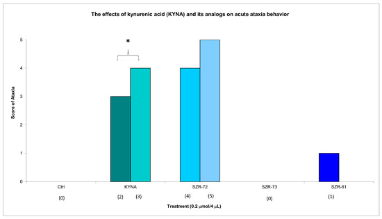 The effects of kynurenic acid and its analogs on acute ataxia behavior. Ataxia symptom scores of KYNA treatment, 0.2 µmol/4 µL KYNA vs. control (Ctrl) group (p = 0.014). We show the number of animals and the score categories. The level of significance and the number of animals in groups * p < 0.05; N(Ctrl) = 10, N(0.2 µmol/4 µL Kyna) = 10, N(0.2 µmol/4 µL SZR-72) = 10, N(0.2 µmol/4 µL SZR-73) = 10, N(0.2 µmol/4 µL SZR-81) = 10. The statistical analysis was a test of Normality with the Kolmogorov–Smirnov post hoc test, Homogeneity of variances with the Levene test and nonparametrical Kruskal–Wallis test. We show the number of animals in brackets.