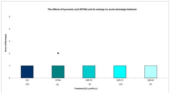 The effects of kynurenic acid and its analogs on acute stereotype behavior. Stereotype symptom scores of KYNA treatment, 0.2 µmol/4 µL KYNA vs. control (Ctrl) group (p = 0.014). We show the number of animals and the score categories. The level of significance and the number of animals in groups * p < 0.05; N(Ctrl) = 10, N(0.2 µmol/4 µL Kyna) = 10, N(0.2 µmol/4 µL SZR-72) = 10, N(0.2 µmol/4 µL SZR-73) = 10, N(0.2 µmol/4 µL SZR-81) = 10. The statistical analysis was a test of Normality with the Kolmogorov–Smirnov post hoc test and Homogeneity of variances with the Levene test and nonparametrical Kruskal–Wallis test. We show the number of animals in brackets.