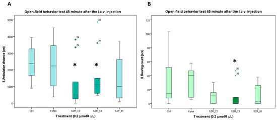 Open-field test 45 min after the i.c.v. injection. (A) Ambulation distance. We found a significant difference between the 0.2 µmol/4 µL SZR-72 vs. the 0.2 µmol/4 µL Kyna (p = 0.046) and the 0.2 µmol/4 µL SZR-72 and SZR_73 vs. control (Ctrl) group (p = 0.046). (B) Rearing count. We found a significant difference between the 0.2 µmol/4 µL SZR-73 vs. the 0.2 µmol/4 µL KYNA and control (Ctrl) group (p = 0.02). We show the data median ± SD. The level of significance and the number of animals in groups * p < 0.05; N(Ctrl) = 10, N(0.2 µmol/4 µL KYNA) = 10, N(0.2 µmol/4 µL SZR-72) = 10, N(0.2 µmol/4 µL SZR-73) = 10, N(0.2 µmol/4 µL SZR-81) = 10. The statistical analyses included a Normality test using the Kolmogorov–Smirnov post hoc test, an assessment of Homogeneity of variances via the Levene test, and the nonparametric Kruskal–Wallis test. KYNA: kynurenic acid; SZR-72: N-(2-(dimethylamino)ethyl)-4-hydroxyquinoline-2-carboxamide hydrochloride; SZR-73: N-(3-(dimethylamino)propyl)-4-hydroxyquinoline-2-carboxamide hydrochloride; SZR-81: 4-hydroxy-N-(2-(pyrrolidin-1-yl)ethyl)quinoline-2-carboxamide hydrochloride.