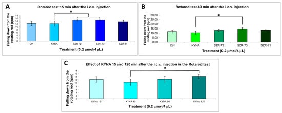 Rotarod behavior test. (A) Falling down from the rotating rod 15 min after the i.c.v. injection. We found significant difference the 0.2 µmol/4 µL SZR-72 (p = 0.032) and 0.2 µmol/4 µL SZR-73 (p = 0.030) vs. the 0.2 µmol/4 µL KYNA group. (B) Falling down from the rotating rod 40 min after the i.c.v. injection. We found significant difference the 0.2 µmol/4 µL SZR-73 vs. the 0.2 µmol/4 µL KYNA group (p = 0.018). (C) Falling down from the rotating rod 15–120 min after the i.c.v. injection. We found significant difference the 0.2 µmol/4 µL KYNA 40 min vs. the 0.2 µmol/4 µL KYNA 120 min group (p = 0.049). We show the data mean ± SEM. The level of significance and the number of animals in groups * p < 0.05; N(Ctrl) = 7, N(0.2 µmol/4 µL KYNA) = 10, N(0.2 µmol/4 µL SZR-72) = 10, N(0.2 µmol/4 µL SZR-73) = 10, N(0.2 µmol/4 µL SZR-81) = 10. The statistical tests used were the Kolmogorov–Smirnov post hoc test for normality, the Levene test for variance Homogeneity, and the one-way ANOVA with LSD post hoc test. RPM: revolution per minute; KYNA: kynurenic acid; SZR-72: N-(2-(dimethylamino)ethyl)-4-hydroxyquinoline-2-carboxamide hydrochloride; SZR-73: N-(3-(dimethylamino)propyl)-4-hydroxyquinoline-2-carboxamide hydrochloride; SZR-81: 4-hydroxy-N-(2-(pyrrolidin-1-yl)ethyl)quinoline-2-carboxamide hydrochloride.