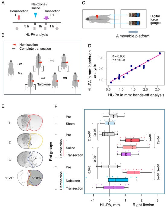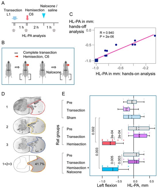 Hindlimb postural asymmetry (HL-PA) induced by right-side hemisection of the cervical spinal cord in rats with prior lumbar spinal transection and the effects of naloxone. (A,B) Experimental design: The lumbar spinal cord was transected completely at the L1–L2 level, followed by right-side hemisection at the C6–C7 level. Saline (n = 7) or naloxone (n = 6) was administered two hours post-hemisection. Five rats with transected spinal cords served as sham-operated controls. HL-PA was measured at three time points: before (Pre), one hour after complete transection, and three hours post-hemisection or sham surgery that was one-hour post-naloxone or saline injection. (C) Pearson correlation between the HL-PA size analyzed by the hands-off and hands-on assay. Data were combined for the saline- and naloxone-treated rat groups and were analyzed 3 h after hemisection, before the administration of these solutions (n = 13). (D) Representative images of the lesion site from a rat with a hemisection at the C6/7 level. Images 1, 2, and 3 depict three adjacent sections representing the submaximal lesion area. The combined image (1 + 2 + 3) illustrates the maximal lesion area (shaded in gray), calculated by stacking the outlined regions from the three sections. In this rat, the lesion encompassed 41.7% of the spinal cord’s cross-sectional area, predominantly affecting the right half. (E) HL-PA size in millimeters, with negative and positive values indicating flexion on the left and right sides, respectively. Boxplots show the distribution (minimum, first quartile, median, third quartile, and maximum), with medians and means indicated by solid and dashed lines, respectively. Individual rat HL-PA values are shown by circles. Statistical analysis: Repeated-measures ANOVA revealed significant effects of hemisection (F(2,32) = 21.79, p < 1 × 10−5) and interaction (F(4,32) = 7.28, p < 3 × 10−4), but no significant group effect (F(2,16) = 0.64, p < 0.54). Tukey’s HSD post hoc p-values are shown.