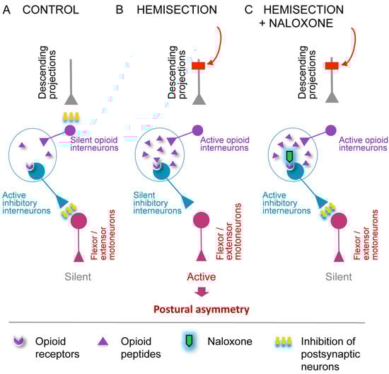 A model for the opioid receptors mediated ipsilateral effects of the LHS on hindlimb posture. (A) Descending projections provide tonic inhibition to opioid neurons in the spinal cord that regulate the activity of inhibitory interneurons projecting onto motoneurons. As a result, motoneurons, which innervate hindlimb extensors and/or flexors, remain inactive. (B) LHS abolishes tonic inhibition of spinal opioid neurons on the injury side, leading to (i) activation and release of opioid peptides by opioid interneurons; (ii) reduced activity of inhibitory interneurons projecting onto motoneurons; (iii) activation of motoneurons; and (iv) a resulting pathological response—HL-PA. (C) As in (B), spinal opioid interneurons are disinhibited on the ipsilateral side due to LHS. They release opioid peptides, for which interaction with opioid receptors expressed by inhibitory interneurons projection to motoneurons is blocked by the general opioid antagonist naloxone. Therefore, the inhibitory interneurons become active again and inhibit the motoneurons. This diminishes the pathological response on the ipsilesional side, reestablishing symmetry in posture and reflexes. The LHS-induced changes in opioid interneurons may account for the injury effects that persist after complete spinal cord transection.