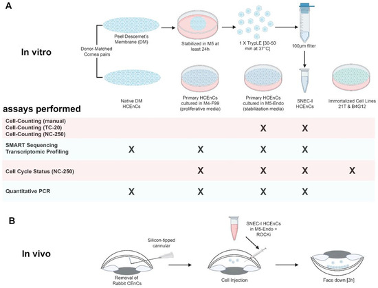 This study was divided into two parts, consisting of (1) a series of experimental in vitro studies to evaluate and optimize the cell counting process and to analyze the cell cycle profiles, as well as (2) a functional in vivo component using an established rabbit model of bullous keratopathy (Figure 1). These studies were acknowledged by the local centralized institutional review board of SingHealth (Reference: 2015/2320) and were conducted in accordance with the Declaration of Helsinki. The in vitro experiments were designed to evaluate the accuracy and consistency of manual versus automated cell-counting approaches using propagated primary human CEnCs. Subsequently, the cell cycle status, gene expressions, and transcriptomic profiles of the SNEC-I-harvested primary human CEnCs in comparison to its donor-match native corneal endothelium and propagated CEnCs were evaluated. Immortalized corneal endothelial cell lines were also included in this analysis. All experiments were performed with a minimum of three paired donor corneas (Supplementary Table S1). For the in vivo functional studies, six New Zealand white rabbits (Oryctolagus cuniculus; 2.5–3.5 kg, 3–6 months old) were used. The use of these animals and their care and treatment strictly adhered to the regulation of the ARVO statement for the Use of Animals in Ophthalmic and Vision Research, and all experimental procedures were approved by the Institutional Animal Care and Use Committee of SingHealth, Singapore (2020/SHS/1544). This study was reported in accordance with ARRIVE guidelines (https://arriveguidelines.org, accessed on 19 May 2025) [25].